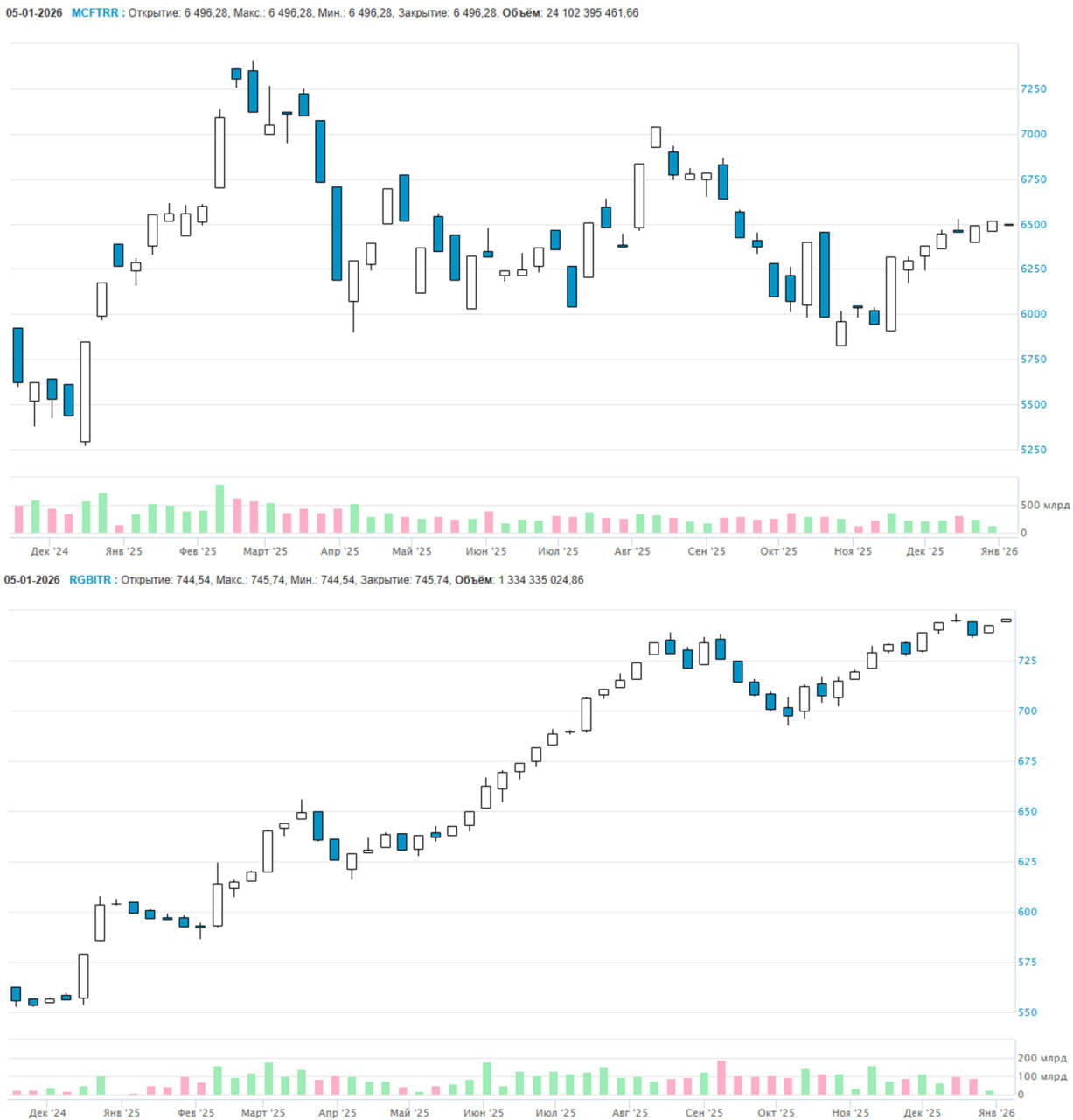 На графиках: Индекс МосБиржи полной доходности и Индекс ОФЗ полной доходности