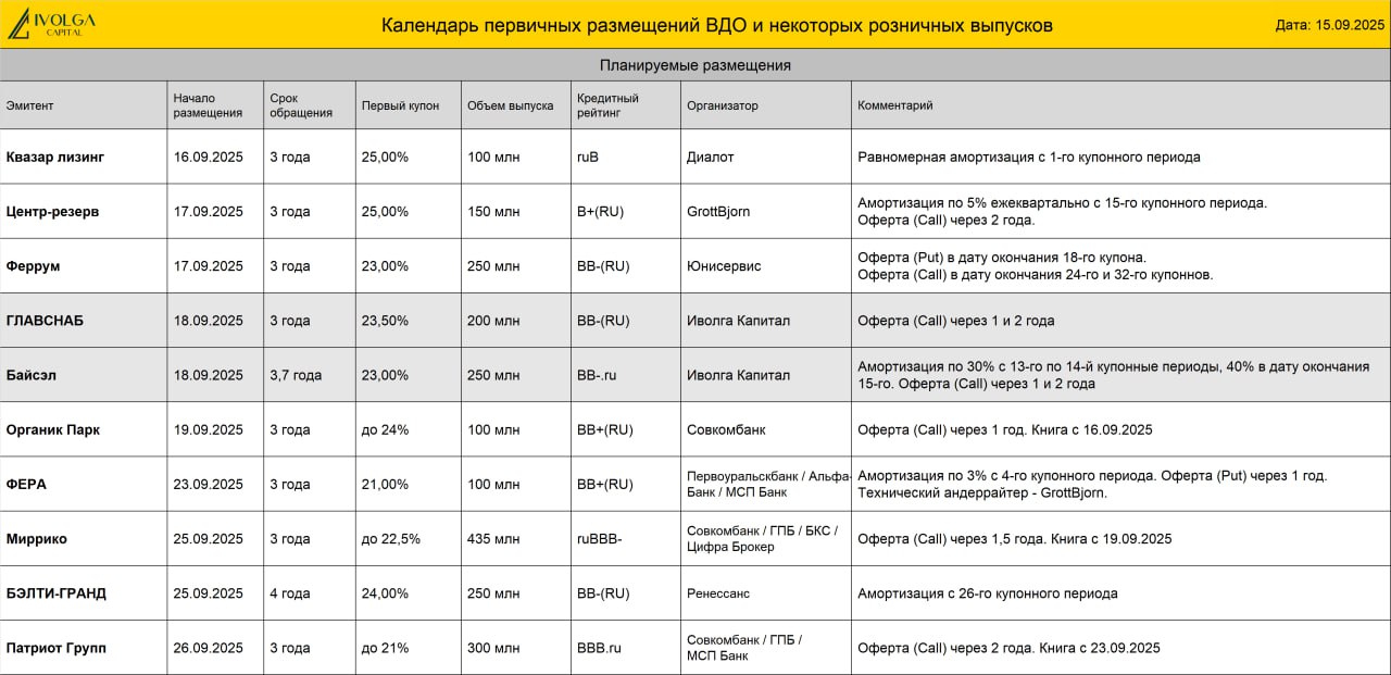 🏗️ Также на 18 сентября запланировано дебютное размещение облигаций платформы по продаже товаров для ремонта и строительства АО «ГЛАВСНАБ» (BB-(RU), 200 млн руб., ставка купона 23,5% на весь срок обращения, YTM 26,2%, дюрация 2,2 года). Интервью с эмитентом YOUTUBE | ВК | RUTUBE
