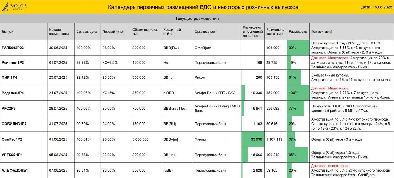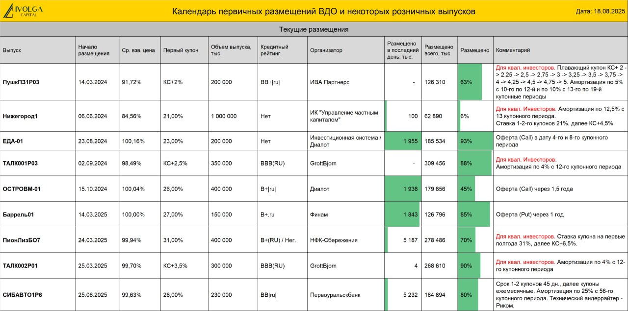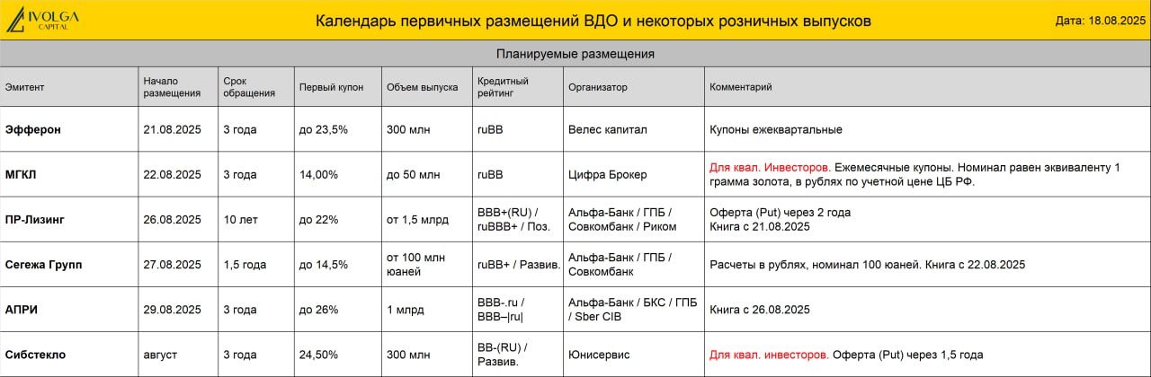 Календарь первичных размещений ВДО и некоторых розничных выпусков