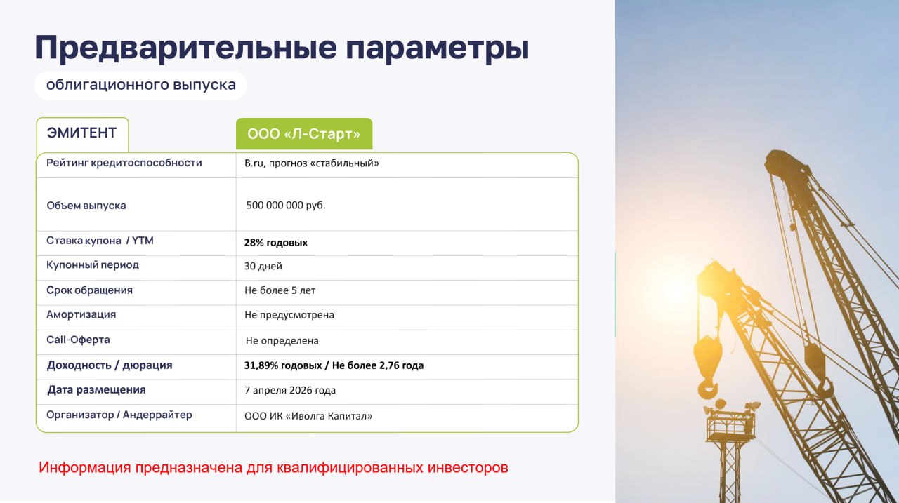 ▶️ Основные предварительные параметры выпуска облигаций Л-Старт:
