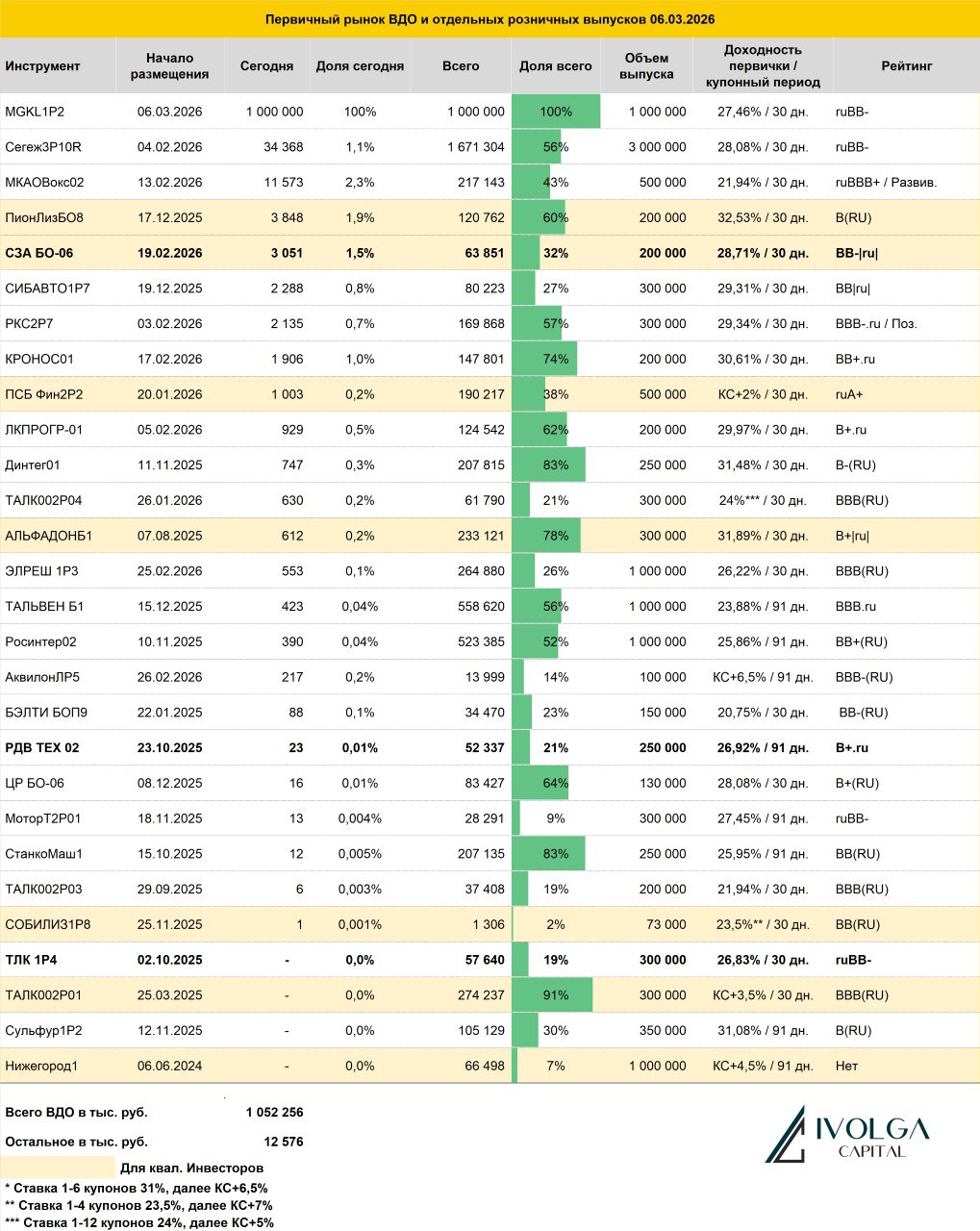 Итоги первичных размещений ВДО и некоторых розничных выпусков на 6 марта 2026 г.